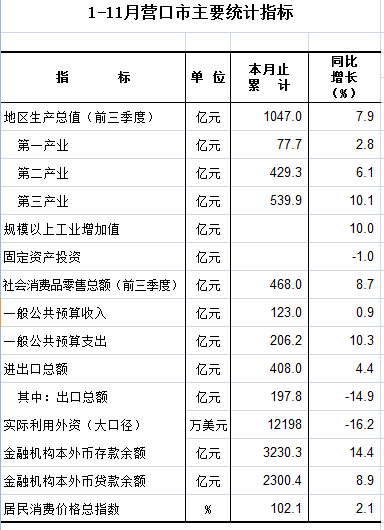 2019年1-11月营口市主要统计指标