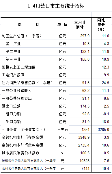2021年1-4月营口市主要统计指标