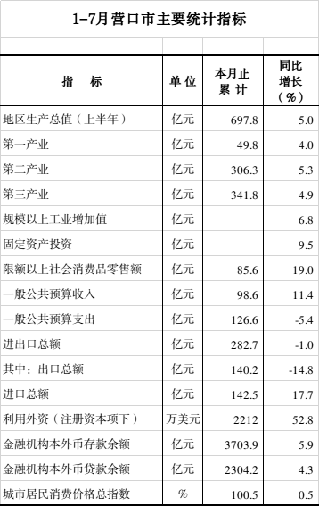 2023年1-7月营口市主要统计指标