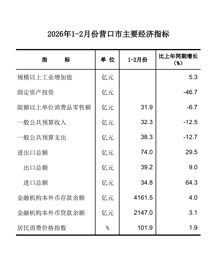 2026年1-2月营口市主要统计指标